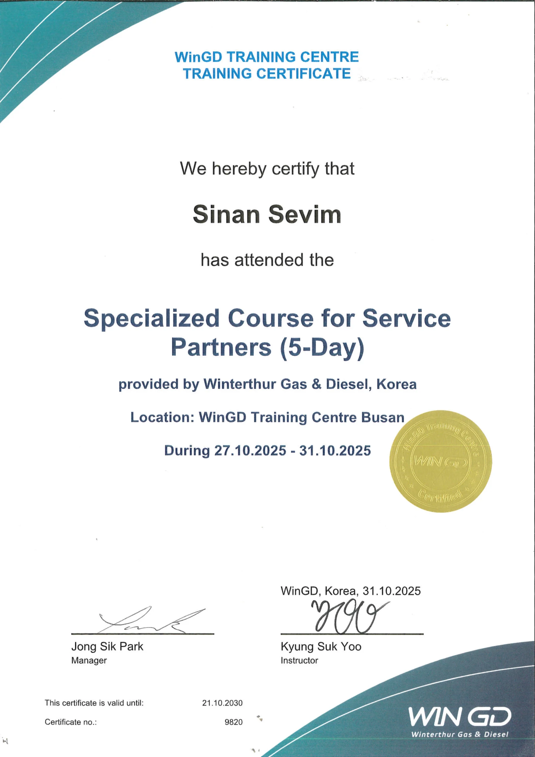 J-ENG Authorised Repair Agent Certificate